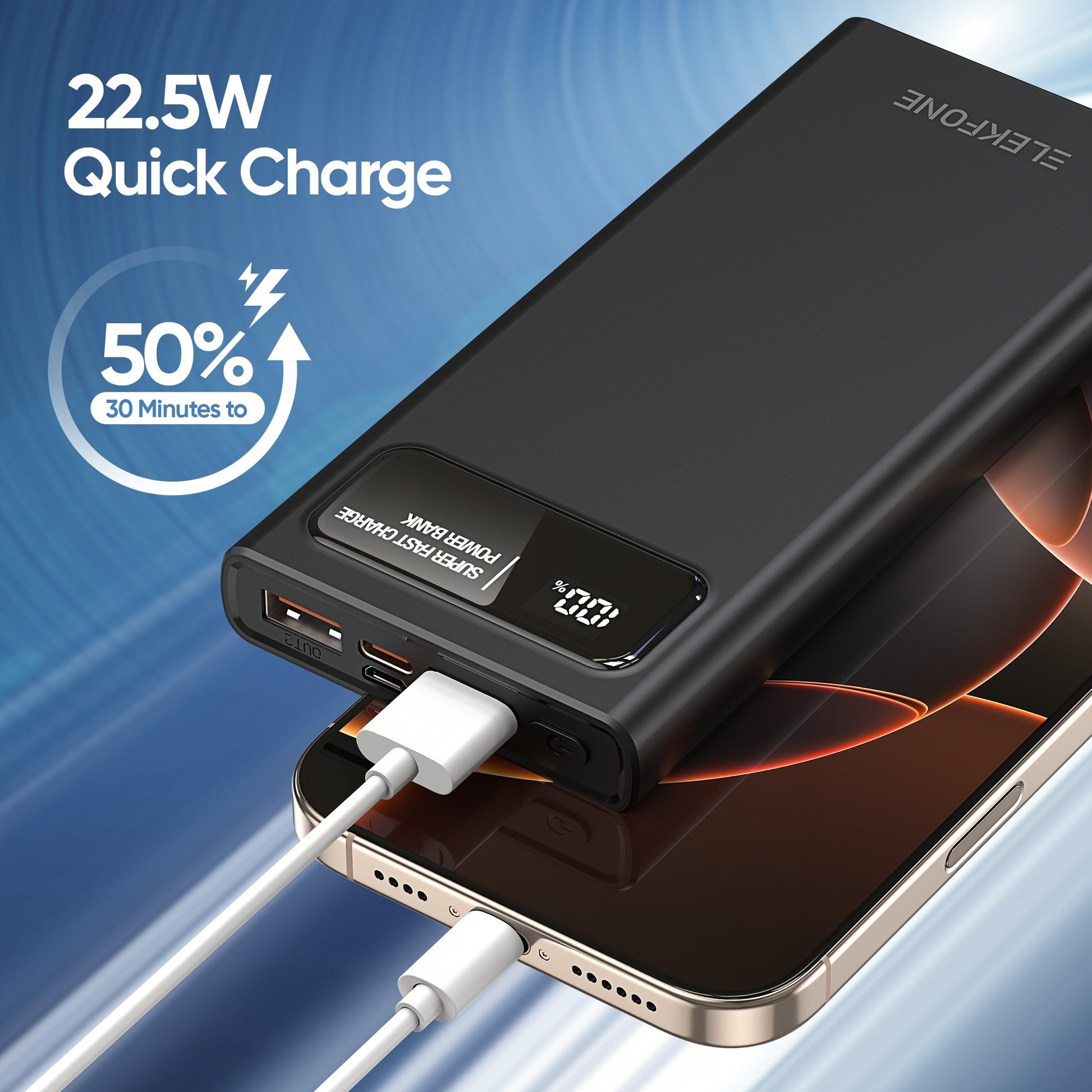 The ELEKFONE 10,000mAh 22.5W Power Bank delivers fast and efficient charging with PD 3.0 technology, charging devices up to 65% in 30 minutes. Its ultra-slim, lightweight design makes it easy to carry anywhere.