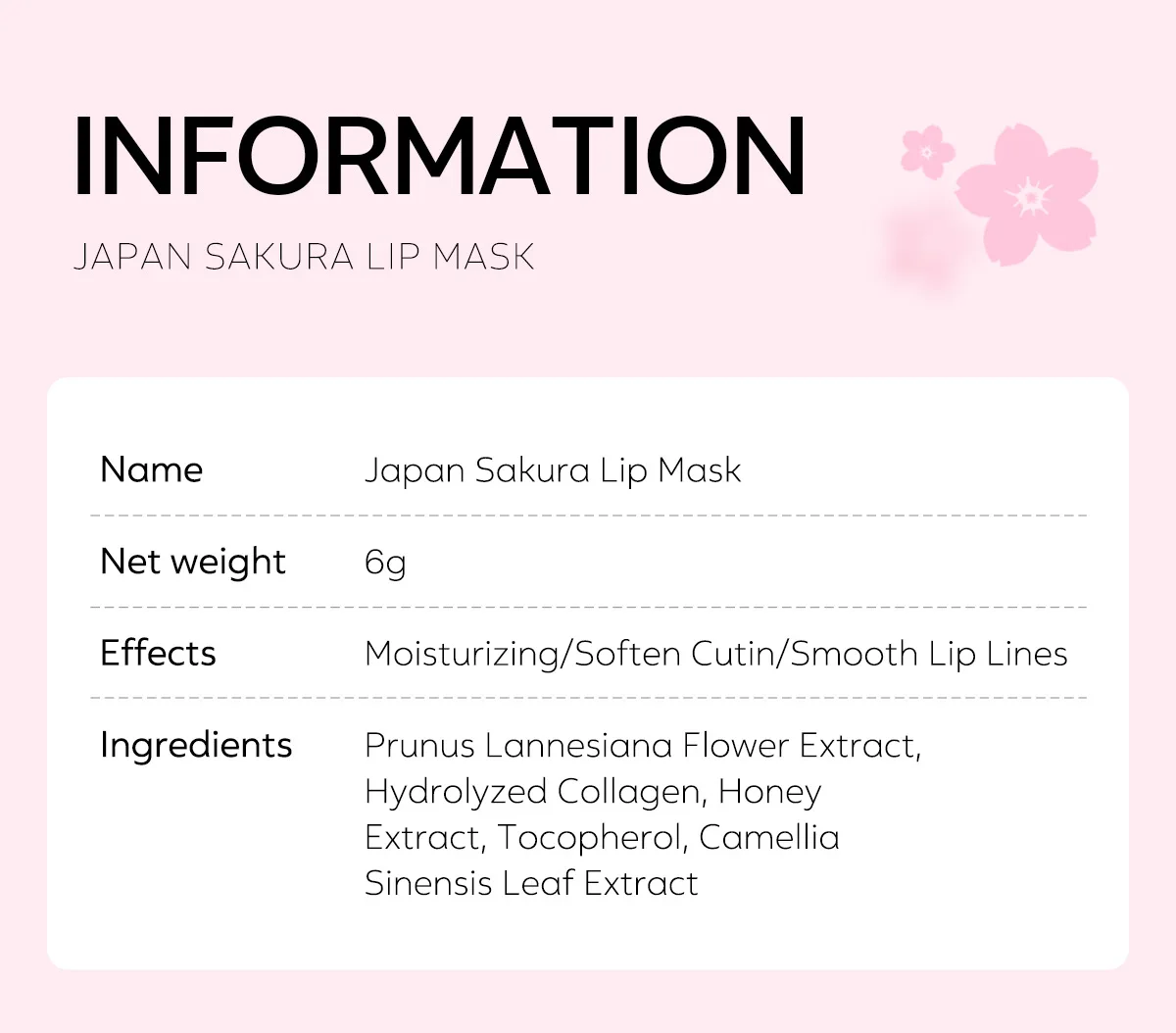 Rich in Prunus Speciosa Flower Extract, Hydrolyzed Collagen, Honey Extract, Tocopherol and other herbal extracts,LAIKOU JAPAN SAKURA HYDRATING LIP MASK can deeply nourish and relieve dry lips, soften dead skin cells on lips, lighten lip lines, brighten lip tone and make lips soft and elastic.